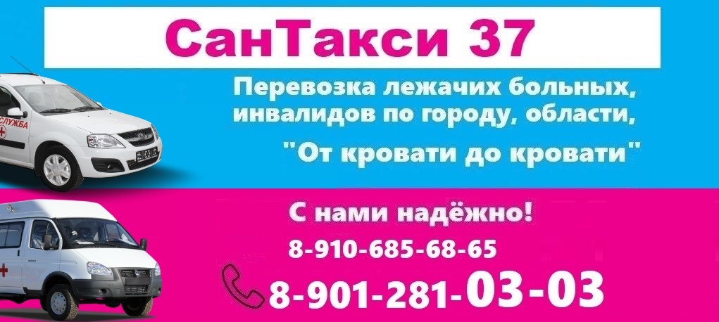 «СанТакси37» - Компания СанТакси37 профессионально занимается перевозкой лежачих больных по городам: Шуя, Кинешма, Родники, Вичуга, Фурманов, Иваново. А также по соседним городам и областям. С нами надежно, безопасно и недорого. Сайт: www.Santaxi37.ru